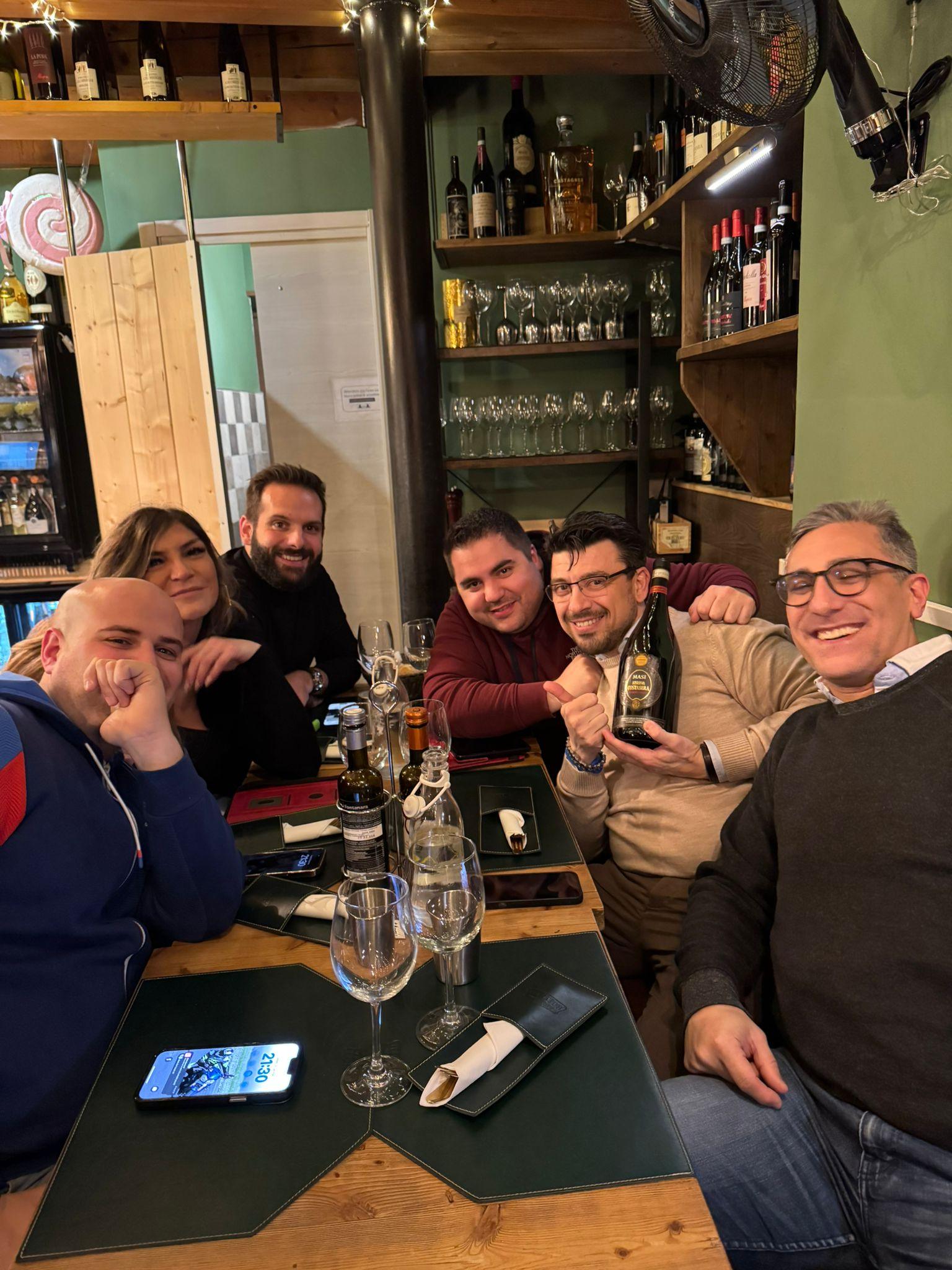Il nostro viaggio è iniziato sabato 25 gennaio, con una partenza pomeridiana da Milano alle 15:30. Luca, Paolo, Marco, Stefano, Valentina e Niccolò, con la musica a palla e tanta voglia di divertirsi, hanno affrontato il viaggio nonostante il meteo non fosse dei migliori: freddo, cielo grigio e una pioggerella fine. Arrivati a Verona, dopo aver preso possesso della nostra base logistica, ci siamo subito diretti verso il cuore pulsante della città, il suo affascinante centro storico, per dare il via ufficiale al weekend con un aperitivo che si è rivelato un vero preludio a una serata memorabile. “La Tradision” si è rivelato un locale suggestivo e perfetto per l’occasione, un’oasi di convivialità dove abbiamo gustato cicchetti tipici, sorseggiato ottimo vino, assaggiato spritz di ogni genere e condiviso un generoso tagliere di salumi e formaggi che hanno stuzzicato l’appetito in attesa della cena.